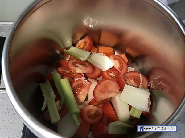 4️⃣ 將切好的蔬菜依序放入鍋內。紅蘿蔔 ➡️ 洋蔥 ➡️ 番茄 ➡️ 西洋芹 ➡️ 川燙好的牛肉 ➡️ 辛香料包