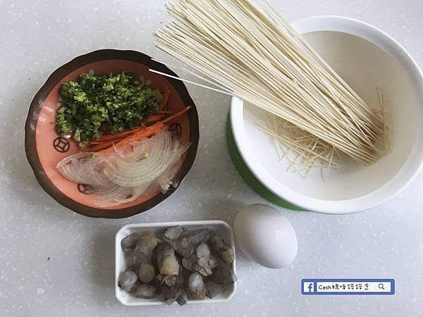 無鹽麵線 、蝦仁 、洋蔥 、紅蘿蔔、綠花椰菜 、蛋
