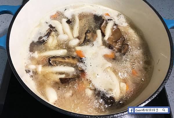 ▼倒入開水 (泡香菇水一起下) ,待水煮滾後轉小火蓋上鍋蓋,悶煮15分鐘