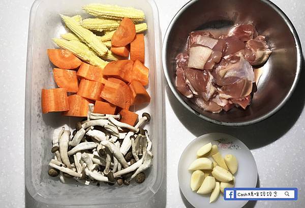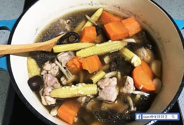 3️⃣ 加入開水之後,依序放入 紅蘿蔔 ➡️ 玉米筍 ➡️ 泡開的乾香菇 ➡️ 香菇水 ➡️ 雞肉 ➡️ 米酒