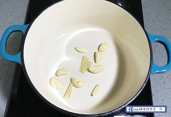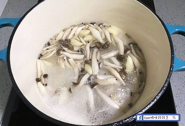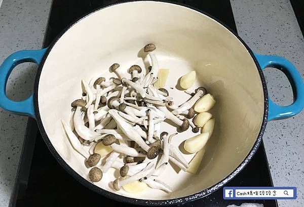2️⃣ 首先以中火爆香薑片、蒜頭,再加入鴻喜菇炒香