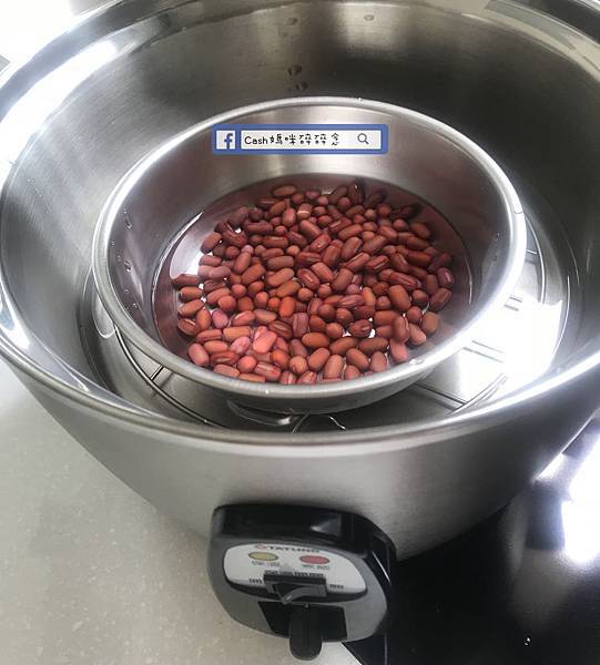 ▼紅豆泡水一天,電鍋外鍋兩杯水蒸熟