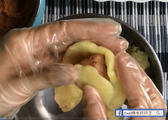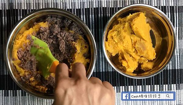 ▼紅豆打泥,地瓜打泥。將紅豆泥加入一半的地瓜泥中拌勻
