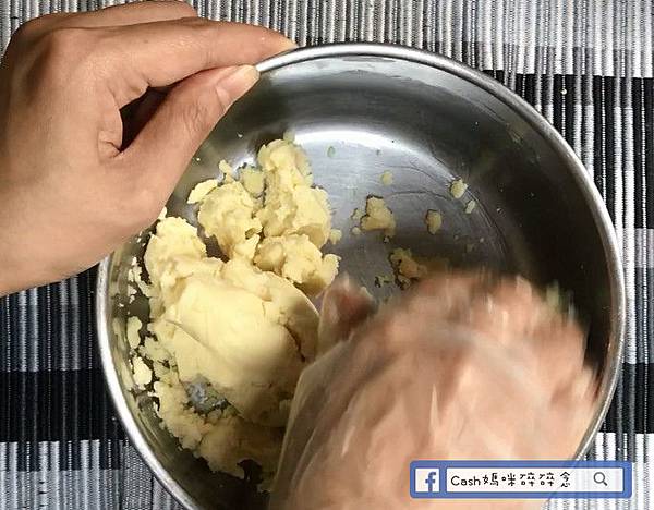 ▼製作餅皮,中筋麵粉、奶油一起混和抓勻