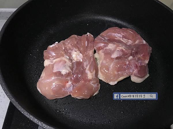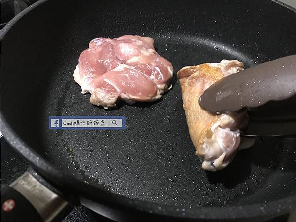 1️⃣ 雞腿肉先煎過,雞皮朝下,將油逼出,煎至一面金黃