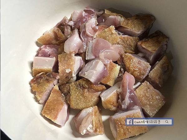 3️⃣ 把切好的雞腿肉放到鑄鐵鍋裡面
