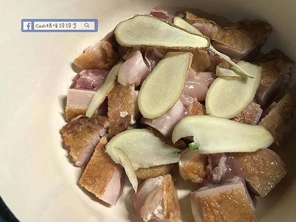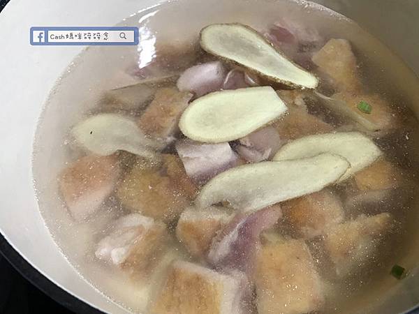 ▼放上薑片,淋上米酒,加入過濾水淹過食材