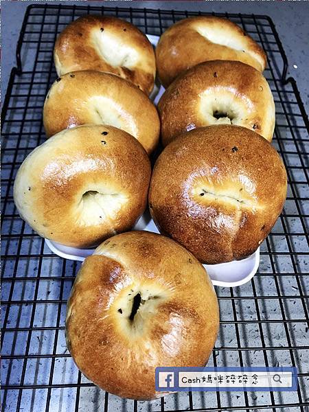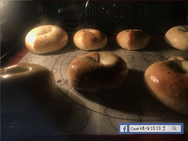 8️⃣ 預熱 200度 的烤箱,烤10分鐘,烤盤掉頭,再噴上一點水,繼續烤 8分鐘,就可以出爐做好的貝果,可以冷凍保存 一個月 ,要吃的時候拿出來電鍋蒸一下,就可以享用 Q軟無比的貝果。