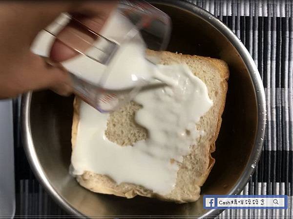 ▼鮮奶倒入白吐司,將吐司抓成一團