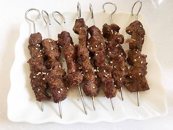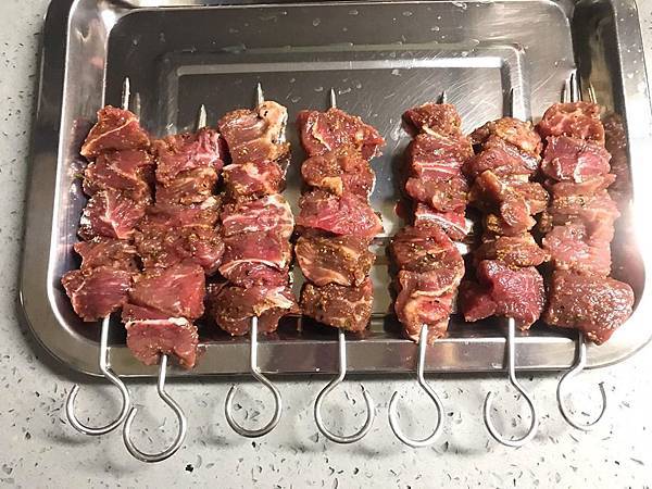 1️⃣ 牛肉切成適當的大小,用米酒、蒜味胡椒稍微醃製一下(20分鐘),再將肉串到叉子上,撒上孜然粉