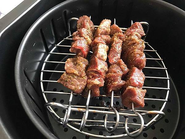 2️⃣ 氣炸鍋放上烤肉架、牛肉串 噴上一點點油