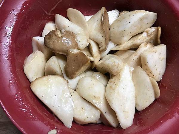 3️⃣ 倒入一些木薯粉/地瓜粉 ,攪拌均勻,讓杏鮑菇上都裹粉