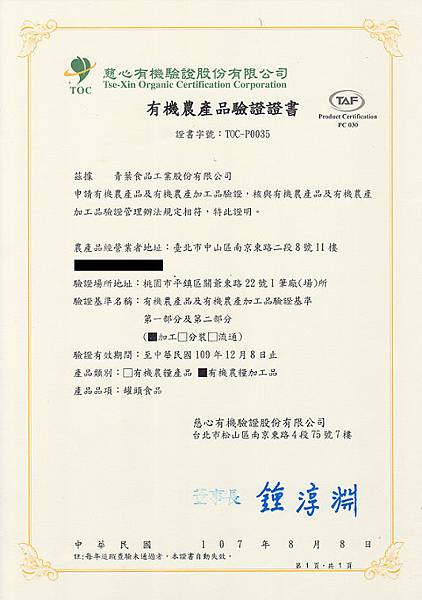 青葉公司通過 HACCP食品安全管制系統認證 與 慈心有機加工認證,安心品質保證,為您的健康把關。