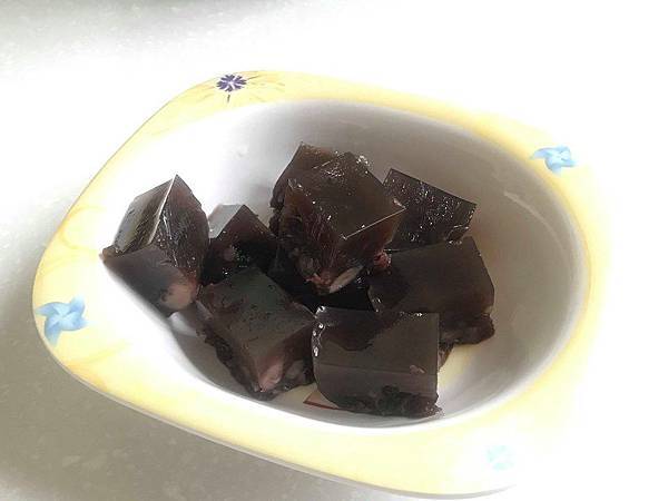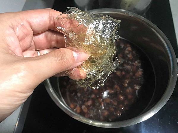 2️⃣ 紅豆湯加熱後,將泡軟的吉利丁片加入紅豆湯中,攪拌至完全融化,放涼備用