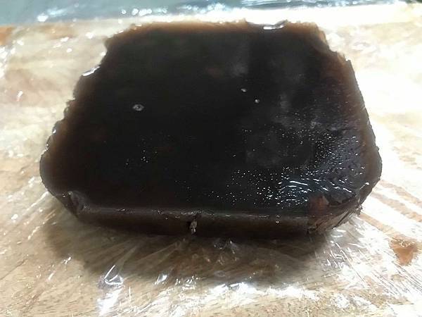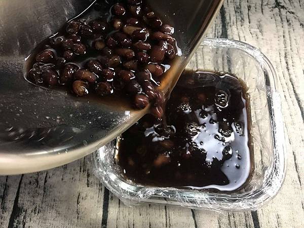 3️⃣ 玻璃保鮮盒鋪上保鮮膜,將以放微涼的紅豆湯倒入,放入冰箱冷藏至凝固