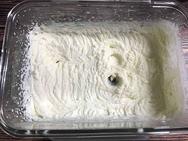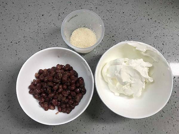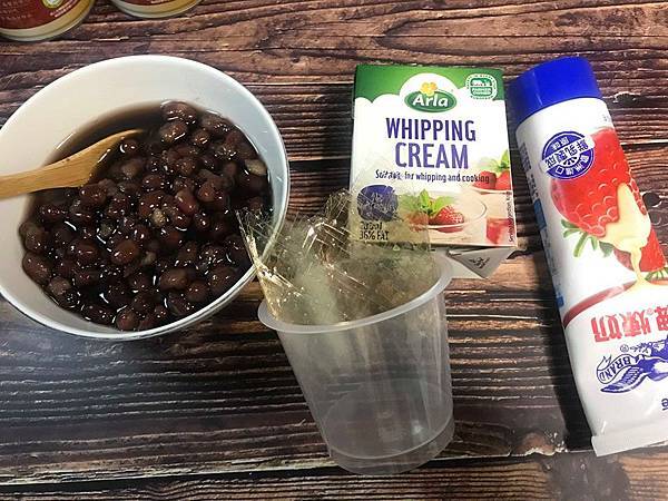3️⃣ 打發冰的鮮奶油,加入以放涼的紅豆煉乳,拌勻,放入冷凍庫