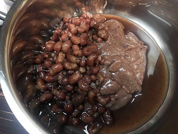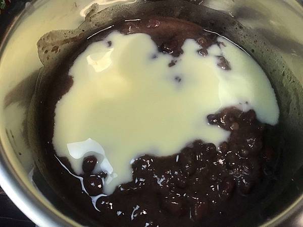 2️⃣ 紅豆湯瀝乾水分,一份打泥,一份保留顆粒,加入煉乳,稍微加熱,加入已軟化的吉利丁拌勻融化,再放涼