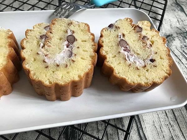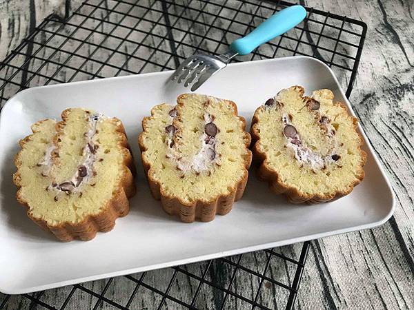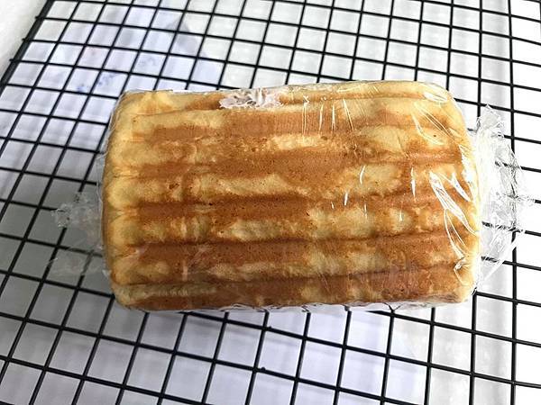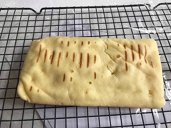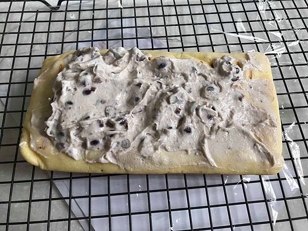 3️⃣ 烤餅完成取出放涼,抹上 材料A 捲起來,包上保鮮膜,冰箱冷藏固定形狀